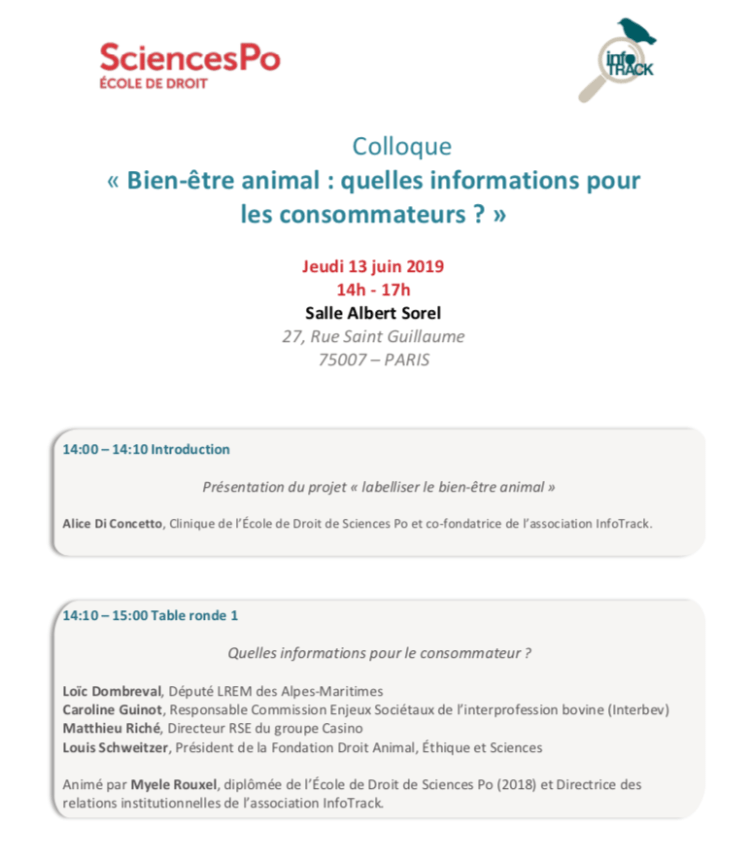 Le jeudi 13 juin 2019 s’est tenu le colloque « Bien-être animal : quelles informations pour les consommateurs? » organisé par les étudiants de la Clinique de l’École de Droit de Sciences Po et l’association lnfoTrack. Un panel de parties prenantes réunissant chercheurs, associations de défense des animaux, éleveurs, acteurs de la grande distribution, et pouvoirs publics, s’est réuni au 27 rue Saint Guillaume pour faire le point sur les défis de l’information des consommateurs sur le bien-être animal et pour réagir aux Principes Directeurs. InfoTrack est très fier d’avoir été l’artisan du premier rassemblement public de l’ensemble des parties prenantes sur le sujet de l’information au consommateur en matière de bien-être animal.