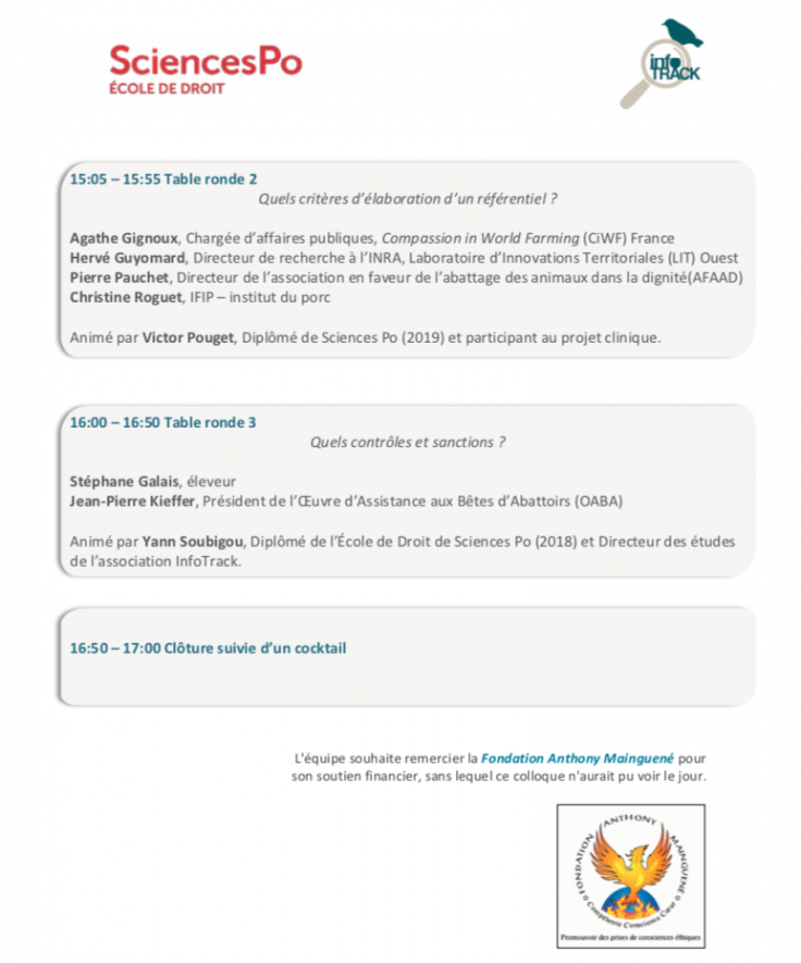 Aude-Solveig Epstein et Alice Di Concetto, respectivement Présidente et Directrice bien-être animal de InfoTrack, sont intervenues le 17 mai 2019 au colloque « La place des animaux dans l’agriculture — bien-être animal, labellisation et qualité », du Master 2 de Droit de l’Agriculture et des Filières Agro-Alimentaires de la Faculté de droit de l’Université Paris 1 Panthéon–Sorbonne.