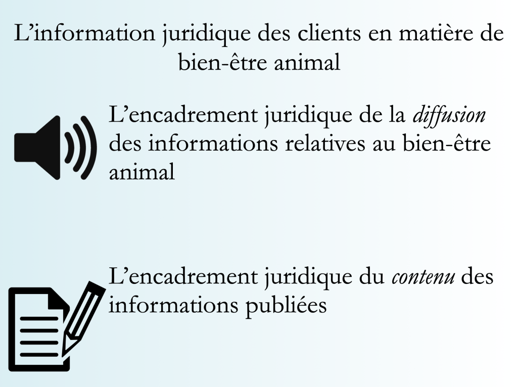 La présentation de l’équipe d’InfoTrack portait sur l’encadrement juridique de l’information des clients en matière de bien-être animal. Cette présentation s’est articulée en deux parties: une première focalisée sur l’encadrement juridique de la diffusion des informations relatives au bien-être animal, une seconde sur l’encadrement juridique du contenu de ces informations une fois publiées.
