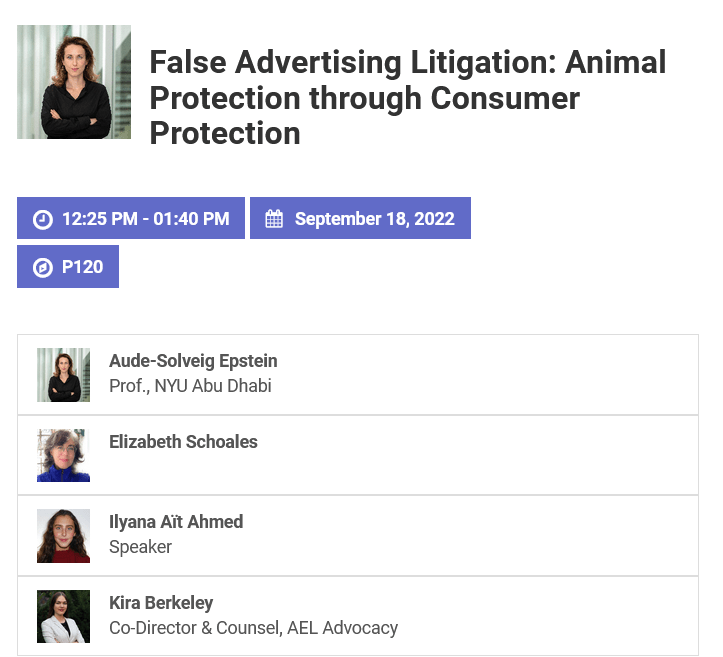 Aude-Solveig Epstein et Ilyana Aït Ahmed ont participé à la Conférence nord-américaine de droit de l’animal qui s’est tenue à Toronto entre le 15 et le 18 septembre 2022. Leur présentation a mis en évidence les défis auxquels se heurtent les plaignants dans les affaires de « humane-washing » et insisté sur le fait qu’en la matière, le contentieux ne devrait pas être perçu comme une fin en soi, mais plutôt comme un levier en vue d’une transformation de la réglementation en vigueur. L’objectif devrait être de :